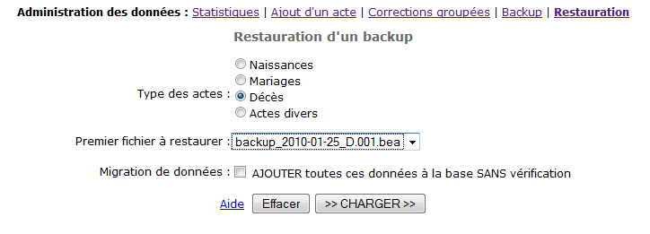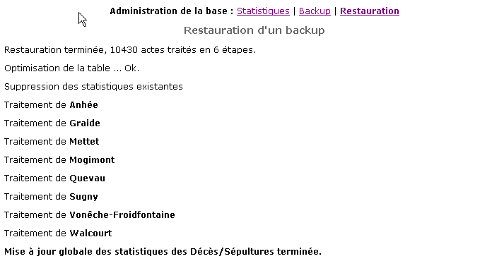 NB : Le backup et la restauration ont pour objectif de garantir la sécurité d'une base de donnée déterminée. Il ne faut pas utiliser la restauration pour "ajouter" des données d'une base dans une autre. Par contre, on peut sans crainte restaurer une base sur des données qui existent déjà. En effet, le logiciel se base sur l'identifiant inerne des actes et ne restaure que les données qui ne sont plus présentes. Il est ainsi par exemple possible de restaurer tous les actes d'une commune qui auraient été supprimés par erreur.