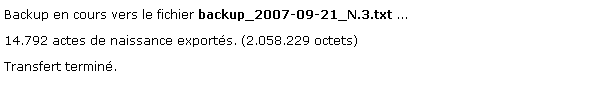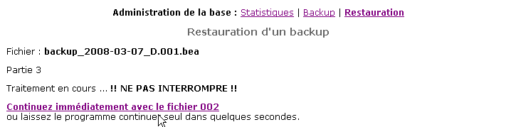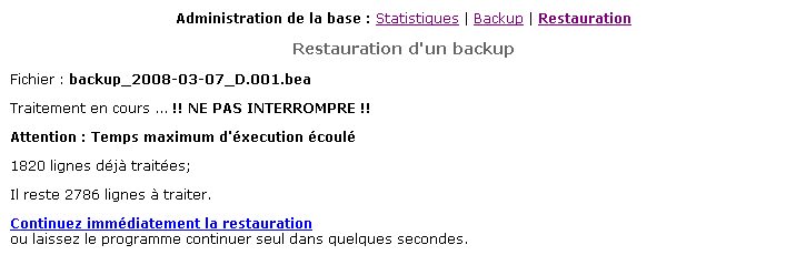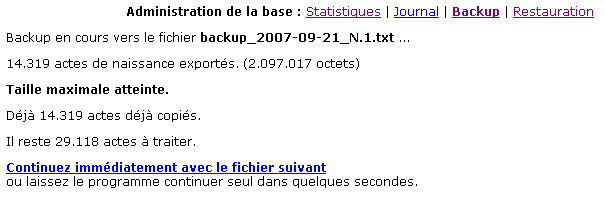 Ces deux limitations compliquent dès lors la réalisation des copies de sauvegarde et des restaurations. Pour y faire face, Expoactes propose un mécanisme qui va découper le backup en une série de fichiers de la taille autorisée (2Mb en général) en veillant également à ne pas outrepasser la limite de temps allouée. Pour automatiser l'opération, Expoactes fait appel au mécanisme de rechargement automatique des pages. De cette façon, dès que le backup est lancé, il suffit de laisser le logiciel créer tour à tour les fichiers jusqu'à ce qu'il indique que le backup est terminé. Si pour une raison où l'autre votre navigateur ne recharge pas automatiquement la page, il suffit de cliquer sur le lien ad hoc qui a le même effet.
